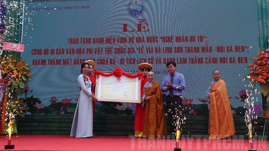 Đại diện Bộ Văn hóa, Thể thao và Du lịch (phải) trao chứng nhận di sản văn hóa phi vật thể quốc gia cho đại diện chùa Bà(Thanhuytphcm.vn) - Ngày 14/8, UBND tỉnh Tây Ninh đã tổ chức Lễ công bố Di sản văn hóa phi vật thể quốc gia “Lễ vía bà Linh Sơn Thánh Mẫu - núi Bà Đen”; trao tặng danh hiệu “Nghệ nhân ưu tú” và khánh thành công trình mở rộng mặt bằng sân chùa Bà - Di tích lịch sử và danh lam thắng cảnh núi Bà Đen.