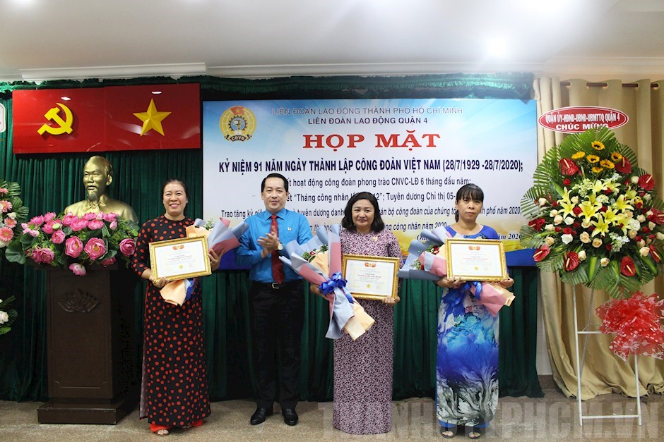 Dịp này, có 3 cá nhân được tặng Kỷ niệm chương “Vì sự nghiệp tổ chức Công đoàn” của Tổng LĐLĐ Việt Nam; 1 cá nhân được tuyên dương danh hiệu “Người cán bộ Công đoàn của chúng tôi” cấp Thành phố; 1 cá nhân được nhận Giấy khen của UBND Quận 4, 40 tập thể và 30 cá nhân được LĐLĐ Quận 4 tặng Giấy khen đạt thành tích trong việc học tập và làm theo tư tưởng, đạo đức, phong cách Hồ Chí Minh giai đoạn 2019 – 2020.