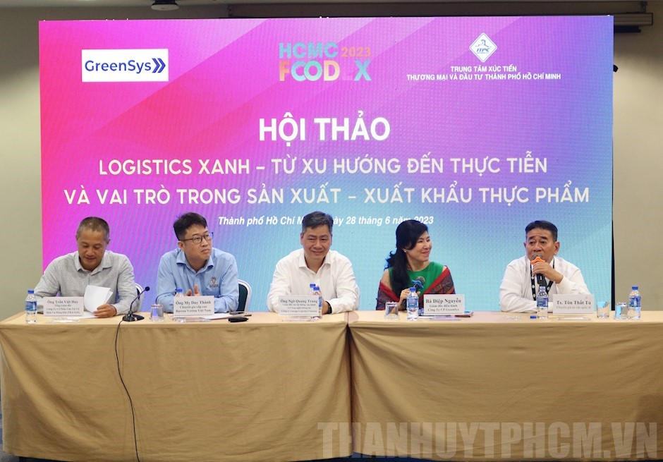 Các đại biểu chủ trì hội thảo(Thanhuytphcm.vn) - Chiều 28/6, Trung tâm Xúc tiến Thương mại và Đầu tư TPHCM (ITPC) phối hợp với Hội Lương thực Thực phẩm TPHCM (FFA) tổ chức Hội thảo “Logistics xanh - Từ xu hướng đến thực tiễn và vai trò trong sản xuất - xuất khẩu thực phẩm”. Hoạt động nằm trong khuôn khổ Triển lãm Quốc tế ngành Lương thực thực phẩm TPHCM 2023 (HCMC FOODEX 2023) được tổ chức từ ngày 28 - 30/06/2023 tại Trung tâm Hội chợ vàTriển lãm Sài Gòn (SECC), Quận 7.