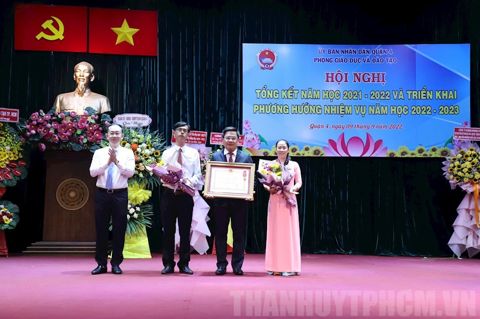 Đồng chí Nguyễn Quốc Thái, Bí thư Quận ủy Quận 4 (bìa trái) trao Huân chương Lao động Hạng 3 cho Trường Tiểu học Nguyễn Thái Bình(Thanhuytphcm.vn) - Sáng 9/9, Phòng Giáo dục và Đào tạo Quận 4 tổ chức hội nghị tổng kết năm học 2021-2022. Dự hội nghị có các đồng chí: Nguyễn Bảo Quốc, Phó Giám đốc Sở Giáo dục và Đào tạo TPHCM; Nguyễn Quốc Thái, Bí thư Quận ủy; Lê Văn Chiến, Chủ tịch UBND Quận 4.