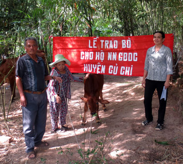 Bà Loan (bìa phải) đại diện Hội Chữ thập đỏ huyện Củ Chi trao bò cho gia đình nạn nhân chất độc da cam.