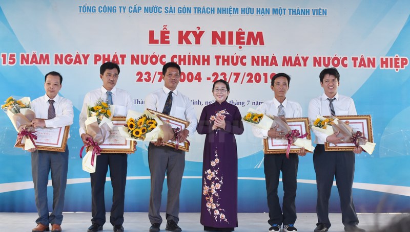 Phó Bí thư Thành ủy TPHCM Võ Thị Dung tặng Bằng khen của UBND TP cho các cá nhân(Thanhuytphcm.vn) - Sáng 23/7, Tổng Công ty cấp nước Sài Gòn TNHH MTV tổ chức lễ kỷ niệm 15 năm ngày phát nước chính thức nhà máy nước Tân Hiệp (23/7/2004 - 23/7/2019). Tham dự có Phó Bí thư Thành ủy TPHCM Võ Thị Dung; Phó Trưởng Ban Dân vận Thành ủy TP Trương Quốc Lâm; Phó Chủ tịch Ủy ban MTTQ Việt Nam TP Triệu Lệ Khánh; Phó Chủ tịch Liên đoàn Lao động TP Kiều Ngọc Vũ.