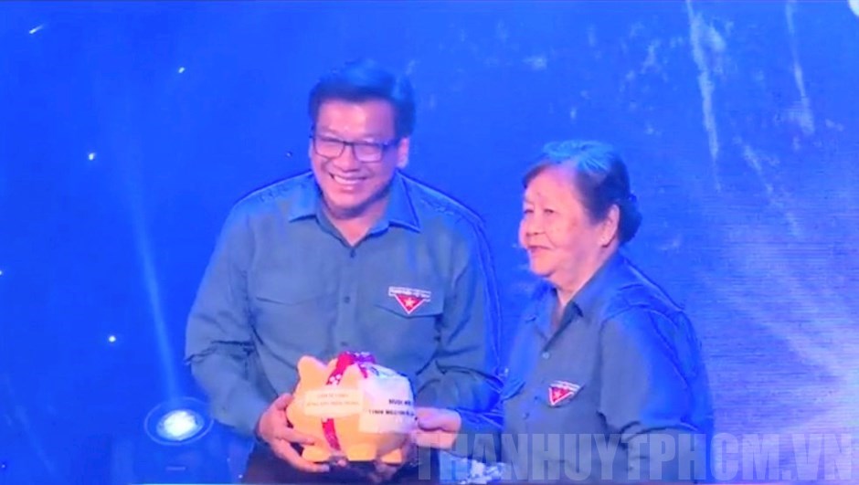 Giám đốc Trung tâm Công tác Xã hội Thanh niên TPHCM Dương Ngọc Tuấn đón nhận con heo đất từ Má phong trào Nguyễn Thị Bạch Cúc(Thanhuytphcm.vn) - Tối 22/10, tại Nhà Văn hóa Thanh niên TPHCM (Quận 1), Hội Liên hiệp Thanh niên Việt Nam TPHCM, Hội Sinh viên Việt Nam TPHCM, Nhà Văn hóa Việt Nam TPHCM phối hợp với nhà thiết kế Việt Hùng và hơn 100 nghệ sĩ (các ca sĩ, diễn viên, hoa hậu, người mẫu, MC, nghệ nhân, họa sĩ…) thực hiện đêm nhạc mang tên “Thương về miền Trung” quyên góp được hơn 3 tỷ đồng và nhiều vật phẩm cần thiết.
