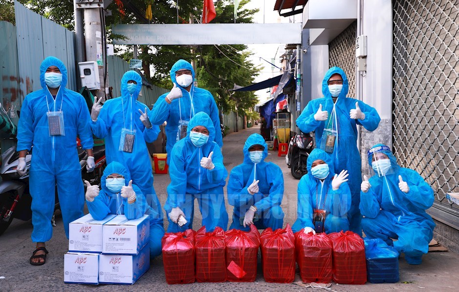 “Cốc, cốc, cốc, cô chú ơi, ra nhận nhu yếu phẩm do phường hỗ trợ đi ạ!” “Chị ơi ra nhận cơm trưa đi ạ!” “Bà ơi, phường có gửi cơm chiều cho bà đây!”, đó là những câu nói trở nên quen thuộc đối với người dân khu phong tỏa tại Phường 16 trong những ngày qua. Ngày ngày, họ rong ruổi khắp các tuyến hẻm để gửi tặng những phần quà, suất ăn nghĩa tình do các tổ chức, cá nhân hảo tâm chia sẻ cho những người dân gặp khó khăn trong khu phong tỏa. Họ là nhóm tình nguyện viên mới được thành lập để đồng hành cùng cán bộ, công chức phường phụ trách công tác chăm lo, giúp đỡ người dân. Đặc biệt hơn, họ lại chính là những người dân trong khu vực phong tỏa.