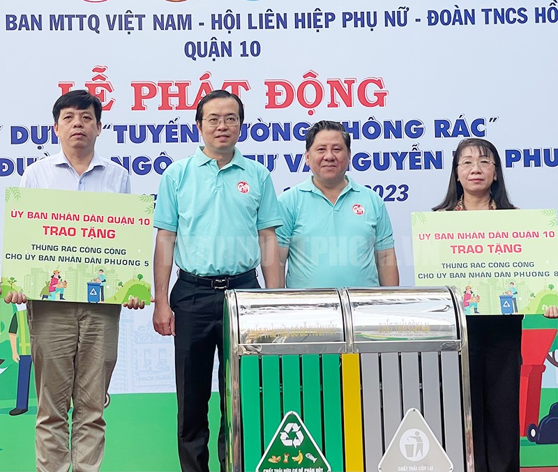 Bí thư Quận ủy Quận 10 Lê Văn Minh và Phó Chủ tịch UBND quận Huỳnh Văn Tâm trao thùng rác công cộng cho UBND phường 2, 4, 5, 8 và 9.(Thanhuytphcm.vn) - Sáng 9/12, UBND Quận 10 phối hợp Ủy ban MTTQ Việt Nam, Hội Liên hiệp Phụ nữ, Quận đoàn Quận 10 tổ chức lễ phát động xây dựng tuyến đường không rác trên tuyến đường Ngô Gia Tự - Nguyễn Tri Phương.