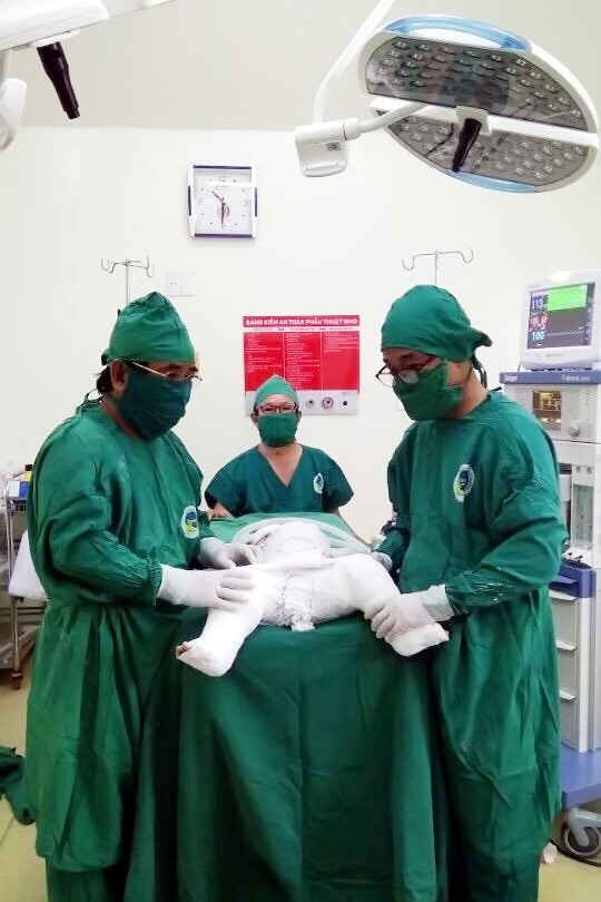 Ca phẫu thuật được BS.CKII Phan Văn Tiếp trực tiếp phẫu thuật. Bé N. được gây mê nội khí quản. Sau đó, các bác sĩ tiến hành rạch da 3cm phía trong bẹn trái và điều trị trật khớp háng bằng phương pháp phẫu thuật Ludloff. Sau đó, bệnh nhi được bó bột bụng đùi bàn chân hai bên (ảnh). Sau phẫu thuật, tình trạng bé ổn định, có thể tháo bột sau 3 tháng và sinh hoạt bình thường, không cần tập vật lý trị liệu.