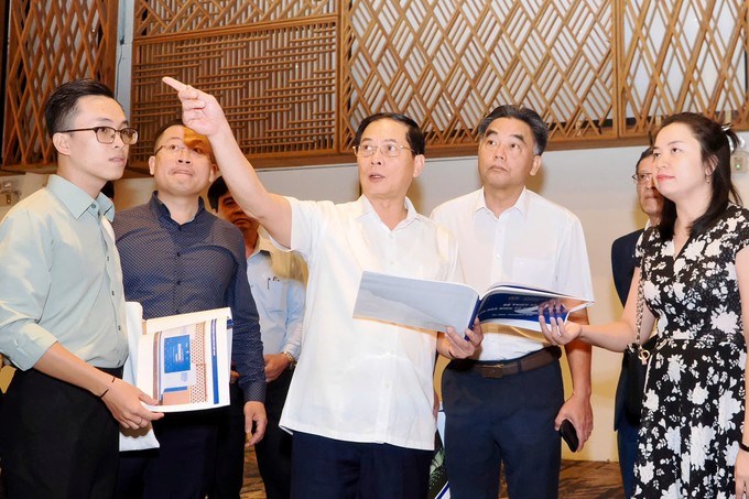Phó Chủ tịch UBND TPHCM Nguyễn Lộc Hà (phải) trao đổi cùng Phó Thủ tướng Bùi Thanh Sơn về công tác chuẩn bị cho diễn đànPhó Thủ tướng nhấn mạnh, toàn bộ hạng mục tại cả hai địa điểm phải được hoàn thành trước chiều 24-11 và sẽ trực tiếp cùng lãnh đạo TPHCM kiểm tra tổng thể lần cuối trước khi Diễn đàn chính thức diễn ra.