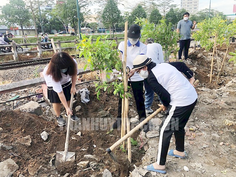 Phường Hiệp Bình Chánh (TP Thủ Đức) trồng cây 50 cây chuông vàng dọc hành lang đường sắt trên tuyến song hành - Kha Vạn Cân. (Nguồn: Thanhuytphcm.vn)(Thanhuytphcm.vn) - UBND TPHCM vừa có chỉ đạo về hỗ trợ, phối hợp triển khai phong trào “Đường tàu - Đường hoa” tại TPHCM theo đề nghị của Sở Xây dựng TP.