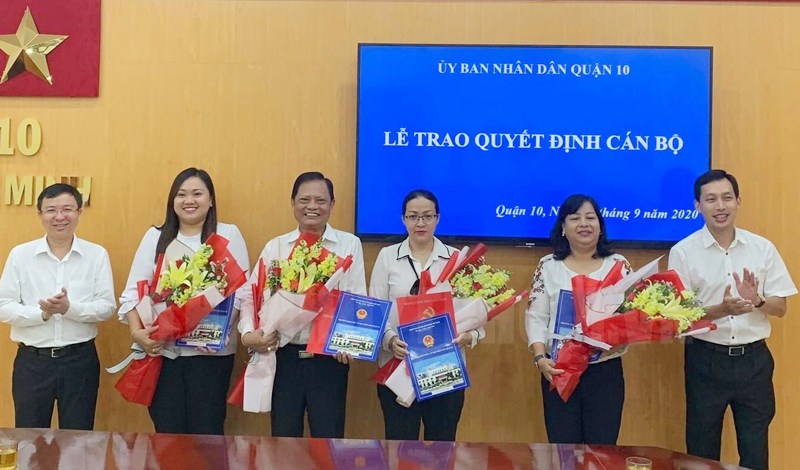 Lãnh đạo Quận 10 trao quyết định và tặng hoa chúc mừng các đồng chí nhận nhiệm vụ mới.(Thanhuytphcm.vn) - Ngày 21/9, UBND Quận 10 tổ chức lễ trao quyết định công tác cán bộ. Đến dự có Bí thư Quận ủy Quận 10 Đặng Quốc Toàn; Chủ tịch UBND Quận 10 Vũ Anh Khoa.