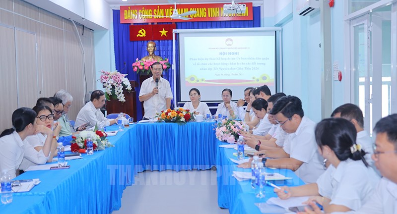 Tại hội nghị, Phó Trưởng phòng Lao động Thương binh - xã hội Quận Nguyễn Thị Ngọc Loan đã tóm tắt các nội dung trọng tâm của dự thảo “Kế hoạch tổ chức các hoạt động chăm lo cho các đối tượng nhân dịp Tết Nguyên đán Giáp Thìn 2024”. Trong đó, nhiệm vụ trọng tâm là thực hiện tốt các chính sách an sinh xã hội, phát huy truyền thống đại đoàn kết, tinh thần “tương thân, tương ái” của dân tộc, chăm lo đời sống vật chất và tinh thần của Nhân dân, bảo đảm mọi nhà, mọi người đều có điều kiện vui đón Tết trong không khí đầm ấm, nghĩa tình. Thông qua các hoạt động thiết thực, hỗ trợ quà Tết đúng đối tượng, kịp thời, tránh sự trùng lắp. Đồng thời, giám sát thực hiện việc trả lương, thưởng Tết cho công nhân lao động ở các cơ sở sản xuất, doanh nghiệp, đảm bảo cho các đối tượng có điều kiện vui Xuân, đón Tết cổ truyền dân tộc với phương châm “Tết an toàn, vui tươi, lành mạnh, tiết kiệm”.