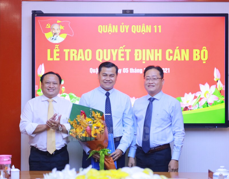 Theo đó, Bí thư Quận ủy Trương Quốc Lâm đã trao Quyết định số 272-QĐ/QU ngày 5/3/2021 về tiếp nhận và bổ nhiệm cán bộ, công chức đối với đồng chí Hà Quang Phát đến nhận nhiệm vụ tại Ban Dân vận Quận ủy, bổ nhiệm giữ chức Phó Trưởng Ban Dân vận Quận ủy kể từ ngày 1/3/2021. Đồng thời, Chủ tịch UBND Quận 11 đã trao Quyết định số 233/QĐ-UBND ngày 26/2/2021 của UBND Quận về việc tiếp nhận và bổ nhiệm đồng chí Cao Hoàng Khương, Chánh Văn phòng Quận ủy Quận 11 giữ chức vụ Trưởng phòng Văn hóa Thông tin Quận 11 kể từ ngày 1/3/2021.