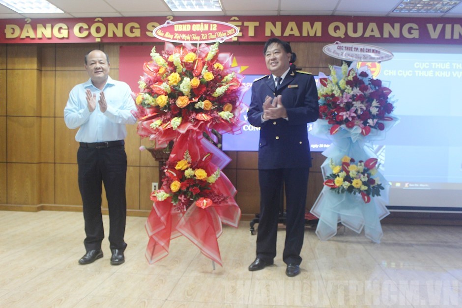 Đồng chí Nguyễn Minh Chánh tặng hoa chúc mừng Chi cục thuế khu vực Quận 12 - huyện Hóc Môn hoàn thành chỉ tiêu thu ngân sách nhà nước năm 2022(Thanhuytphcm.vn) - Ngày 28/12, Chi cục thuế khu vực Quận 12 - huyện Hóc Môn tổ chức Hội nghị tổng kết công tác thuế năm 2022 và triển khai nhiệm vụ, giải pháp năm 2023. Đến tham dự Hội nghị có các đồng chí: Thái Minh Giao, Phó Cục trưởng Cục thuế TPHCM; Nguyễn Minh Chánh, Quận ủy viên, Phó Chủ tịch UBND Quận 12.