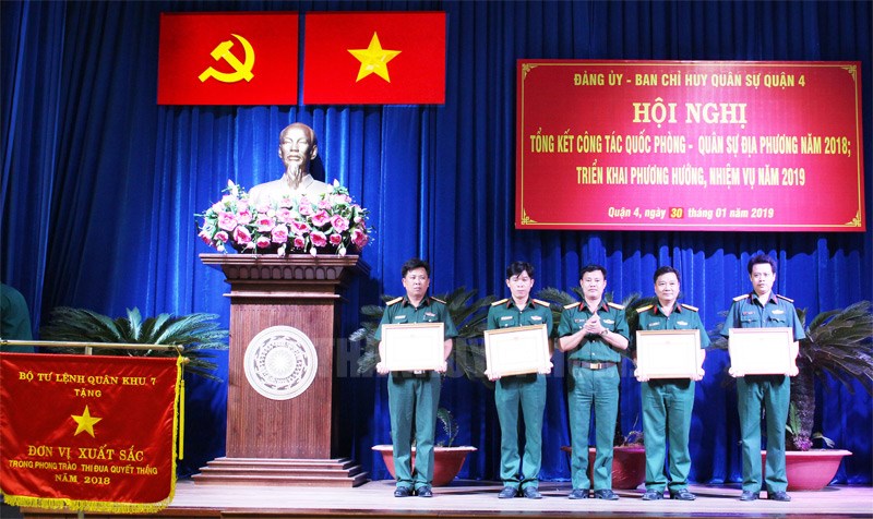 Tại hội nghị, Bộ Tư lệnh Thành phố tặng Giấy chứng nhận “Đơn vị tiên tiến” cho 1 tập thể, danh hiệu “Chiến sĩ thi đua” cho 1 cá nhân, danh hiệu “Chiến sĩ tiên tiến” cho 2 cá nhân; 14 tập thể và 31 cá nhân được UBND quận tặng Giấy khen có thành tích xuất sắc trong phong trào Thi đua Quyết thắng lực lượng vũ trang Quận 4 năm 2018.