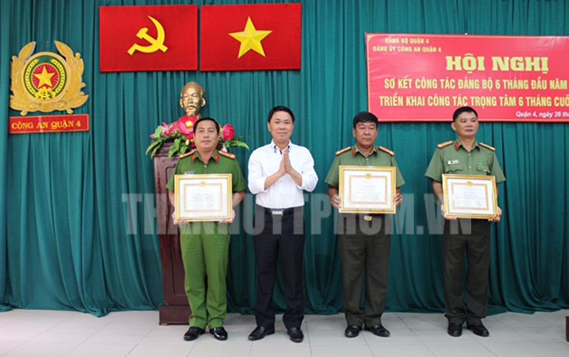 Chủ tịch UBND Quận 4 Trần Hoàng Quân (thứ 2, từ trái sang) trao giấy khen cho các cá nhân(Thanhuytphcm.vn) – Ngày 26/7, Đảng ủy Công an Quận 4 tổ chức hội nghị sơ kết công tác Đảng bộ 6 tháng đầu năm, triển khai công tác trọng tâm 6 tháng cuối năm 2017. Đến dự có đồng chí Trần Hoàng Quân, Chủ tịch UBND Quận 4.