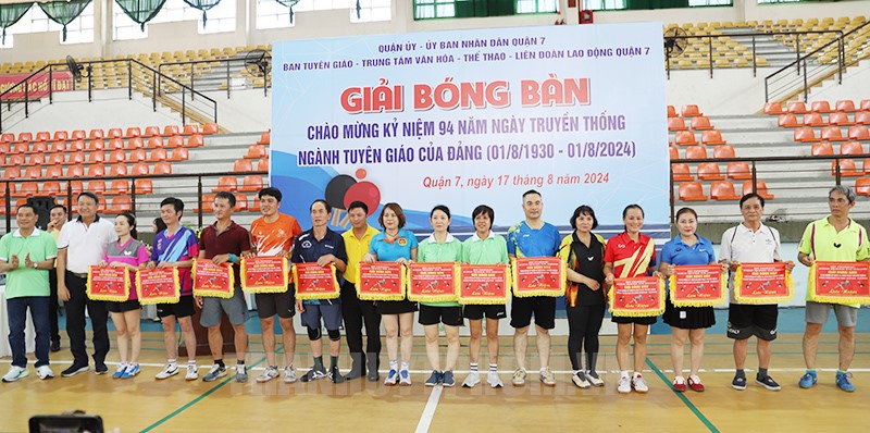 Ban tổ chức trao cờ lưu niệm cho các đội thi đấu.(Thanhuytphcm.vn) - Sáng 17/8, Ban Tuyên giáo Quận ủy Quận 7 phối hợp Liên đoàn Lao động và Trung tâm Văn hóa - Thể thao Quận tổ chức Giải Bóng bán chào mừng kỷ niệm 94 năm ngày truyền thống ngành Tuyên giáo của Đảng (01/8/1930 – 01/8/2024).