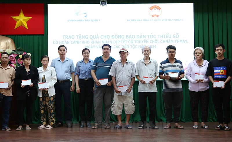 Đồng chí Khưu Tuệ Nhàn, đại diện Ban Dân tộc TPHCM và đồng chí Nguyễn Dũng Hùng, Chủ tịch Ủy ban MTTQ Việt Nam Quận 7 tặng quà cho đồng bào dân tộc thiểu số.(Thanhuytphcm.vn) - Chiều 14/5, UBND Quận 7 phối hợp Ủy ban MTTQ Việt Nam Quận, Hội LHPN Quận và Quận Đoàn tổ chức Liên hoan văn hóa ẩm thực các món ăn truyền thống của đồng bào dân tộc thiểu số chào mừng hội nghị đại biểu các dân tộc thiểu số Quận 7 lần thứ III năm 2024; trao tặng quà cho các hộ đồng bào dân tộc thiểu số có hoàn cảnh khó khăn trên địa bàn Quận.