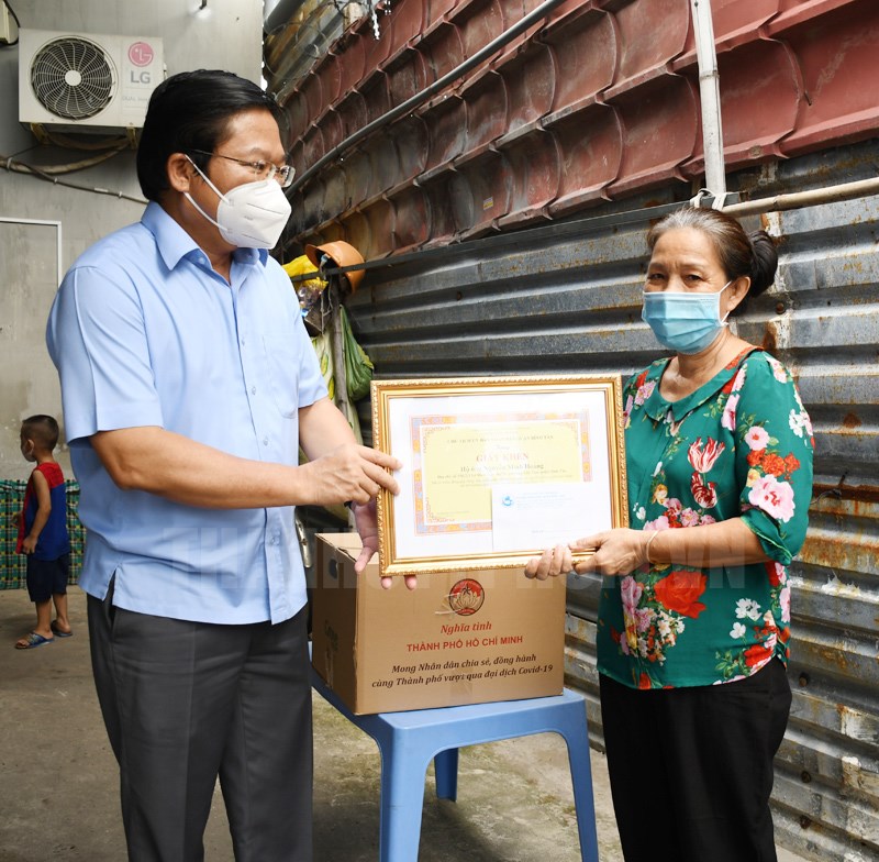 Phó Bí thư Thường trực Quận ủy Nguyễn Việt Quế Sơn tặng giấy khen chủ nhà trọ Nguyễn Thị Hạnh phường Tân Tạo A. Ngoài ra, quận còn vận động các doanh nghiệp, cá nhân hảo tâm, người dân cả nước đóng góp trên 87 tỷ đồng để chăm lo các đối tượng bị ảnh hưởng dịch bệnh Covid-19…