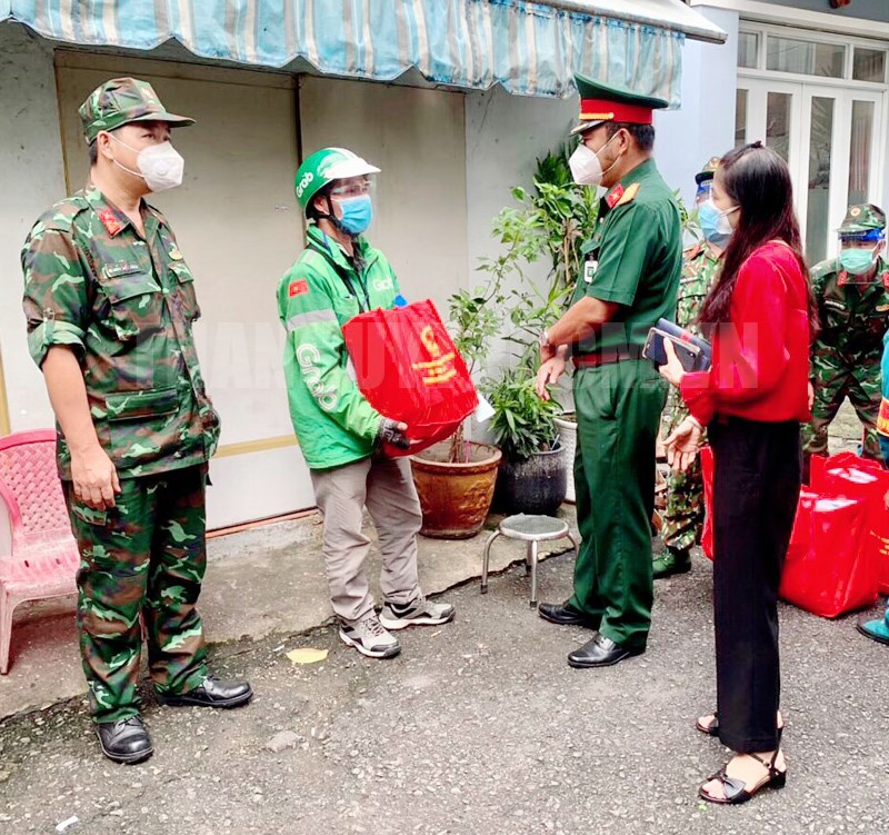 Các đồng chí Ban Chỉ huy quân sự quận trao quà hỗ trợ người dân tại phường 2.(Thanhuytphcm.vn) - Nhằm kịp thời hỗ trợ và thực hiện tốt an sinh xã hội để tạo điều kiện hỗ trợ người dân giảm bớt khó khăn do tác động của dịch bệnh Covid-19, UBND quận Bình Thạnh đã triển khai phương án hỗ trợ đợt 3 cho người dân bị ảnh hưởng bởi dịch Covid-19 với mức hỗ trợ 1.000.000 đồng/người/lần.