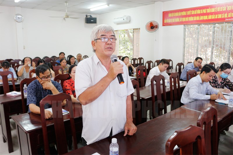 Đại diện hộ dân nêu ý kiến tại Hội nghị(Thanhuytphcm.vn) - Chiều 12/11, Ban Bồi thường - Giải phóng mặt bằng quận Gò Vấp đã phối hợp với Ban Quản lý dự án đầu tư xây dựng các công trình giao thông Thành phố và UBND Phường 7, quận Gò Vấp tổ chức Hội nghị triển khai các thông tin liên quan đến dự án Mở rộng, nâng cấp đường Dương Quảng Hàm, đoạn từ quận Bình Thạnh đến Công viên Văn hóa quận Gò Vấp.