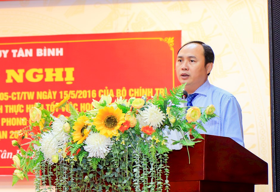 Bí thư Quận ủy Lê Hoàng Hà phát biểu tại hội nghị(Thanhuytphcm.vn)- Ngày 22/4, Quận ủy quận Tân Bình tổ chức hội nghị sơ kết 5 năm thực hiện Chỉ thị số 05-CT/TW của Bộ Chính trị và biểu dương các gương điển hình thực hiện tốt việc học tập và làm theo tư tưởng, đạo đức, phong cách Hồ Chí Minh. Tham dự hội nghị có các đồng chí: Lê Hoàng Hà, Bí thư Quận ủy; Nguyễn Hoàng Long, Phó Bí thư thường trực Quận ủy; Nguyễn Bá Thành, Chủ tịch UBND quận Tân Bình…