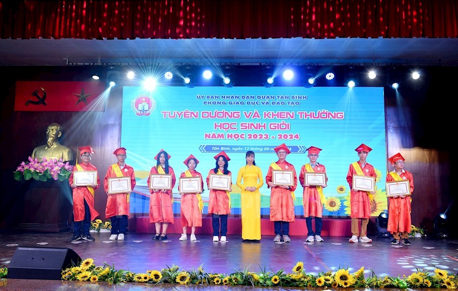 Phó Chủ tịch UBND quận Lê Thị Thu Sương tặng giấy khen đến các em học sinh giỏi năm học 2023-2024(Thanhuytphcm.vn) - Ngày 17/5, Phòng Giáo dục và Đào tạo (GD-ĐT) quận Tân Bình tổ chức lễ tuyên dương và khen thưởng học sinh giỏi, năm học 2023-2024. Dự buổi lễ có các đồng chí: Lê Thị Thu Sương, Ủy viên Ban Thường vụ Quận ủy, Phó Chủ tịch UBND quận; Nguyễn Xuân Tiến, Ủy viên Ban Thường vụ Quận ủy, Trưởng Ban Tuyên giáo Quận ủy; Lê Thị Thu Trà, Phó Chủ tịch Ủy ban MTTQ Việt Nam quận; Hoàng Văn Tài, Quận ủy viên, Trưởng Phòng Nội vụ quận; Trần Minh Vũ, Quận ủy viên, Trưởng Phòng Tài chính - Kế hoạch quận…