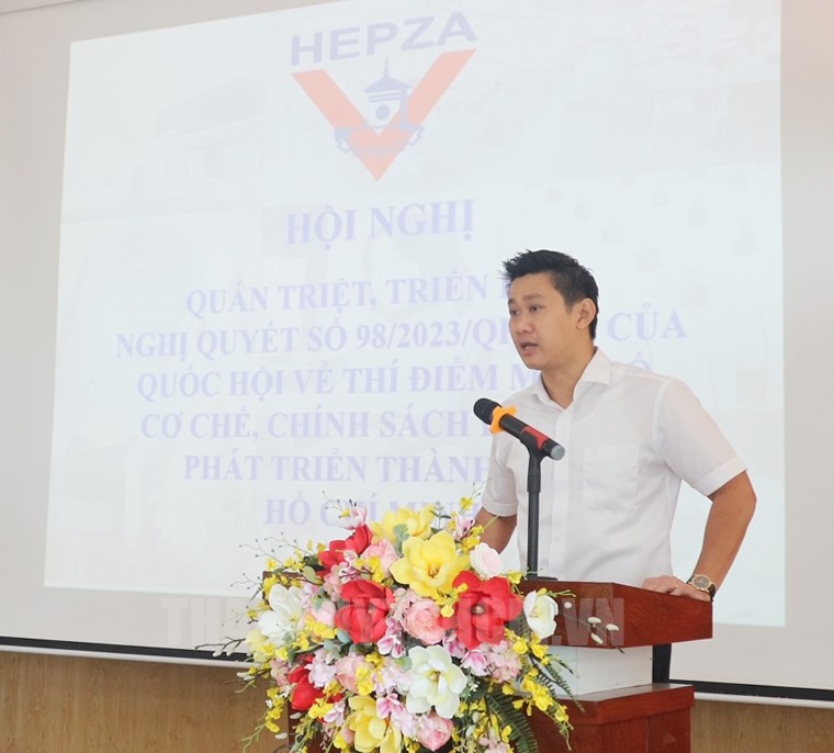Đồng chí Hứa Quốc Hưng báo cáo tóm tắt nội dung Nghị quyết 98/2023/QH15 tại hội nghị(Thanhuytphcm.vn) - Ngày 28/7, Đảng ủy BQL Các KCX và CN TPHCM tổ chức Hội nghị triển khai thực hiện Nghị quyết số 98/2023/QH15 của Quốc hội về thí điểm một số cơ chế, chính sách đặc thù phát triển TPHCM. Đồng chí Hứa Quốc Hưng, Bí thư Đảng ủy, Trưởng ban BQL Các KCX và CN Thành phố dự và chủ trì hội nghị.