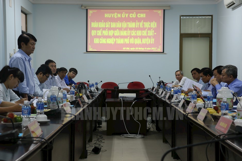 Tại buổi làm việc, Huyện ủy Củ Chi cho biết: trên địa bàn huyện có 2.613 doanh nghiệp đang hoạt động, gồm 72 doanh nghiệp 100% vốn nước ngoài và 2.541 doanh nghiệp trong nước với 83.855 lao động. Huyện ủy đã quan tâm lãnh đạo, chỉ đạo thực hiện tốt việc thực hiện quy chế phối hợp này; thực hiện tốt trong công tác phối hợp tuyên truyền các chủ trương của Đảng, chính sách pháp luật của Nhà nước; tình hình an ninh, trật tự trong các doanh nghiệp tương đối ổn định, tạo thuận lợi cho hoạt động của các tổ chức chính trị - xã hội trong các doanh nghiệp, tạo điều kiện thuận lợi cho các doanh nghiệp ổn định sản xuất, tăng năng suất.