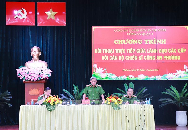 Đại tá Lê Công Thức, Trưởng Công an Quận 4 điều hành chương trình đối thoại.(Thanhuytphcm.vn) - Sáng 15/3, Công an Quận 4 tổ chức Chương trình đối thoại trực tiếp giữa lãnh đạo các cấp với cán bộ chiến sĩ Công an phường. Tham dự có các đồng chí: Thượng tá Nguyễn Đình Dương, Phó Giám đốc Công an TPHCM; Nguyễn Quốc Thái, Bí thư Quận ủy Quận 4; Lê Văn Chiến, Chủ tịch UBND Quận 4.