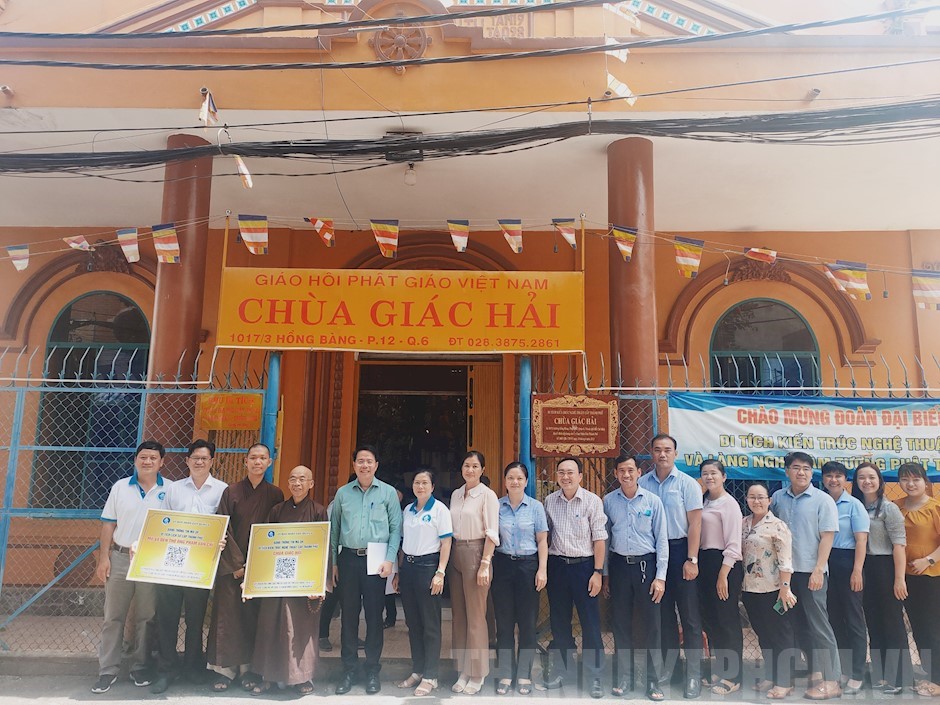 Các đại biểu chụp ảnh lưu niệm tại Chùa Giác Hải – 1 trong 06 di tích của công trình số hóa(Thanhuytphcm.vn) - Sáng 8/8, UBND Quận 6 tổ chức Lễ ra mắt giới thiệu mã QR tại các di tích và điểm tham quan du lịch trên địa bàn.