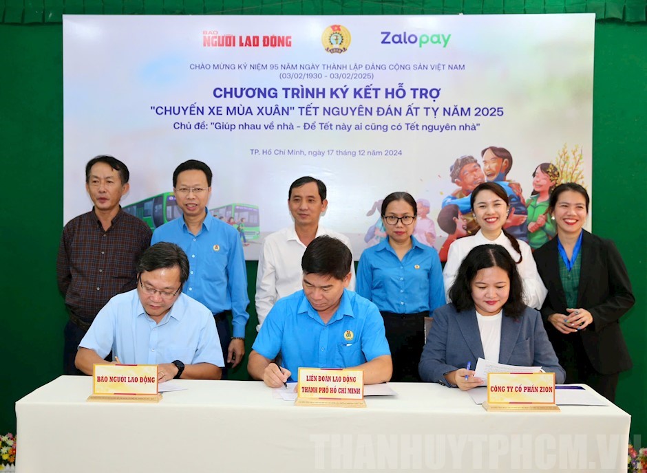 Đại diện các đơn vị ký kết tại chương trình.(Thanhuytphcm.vn) - Chiều 17/12, Liên đoàn Lao động TPHCM, Báo Người Lao Động và Công ty Cổ phần ZION (Zalopay) ký kết phối hợp tổ chức chương trình “Chuyến xe mùa Xuân” năm 2025 đưa đoàn viên, người lao động về quê đón Tết Ất Tỵ 2025 với chủ đề: “Giúp nhau về nhà - Để Tết này ai cũng có Tết nguyên nhà”.