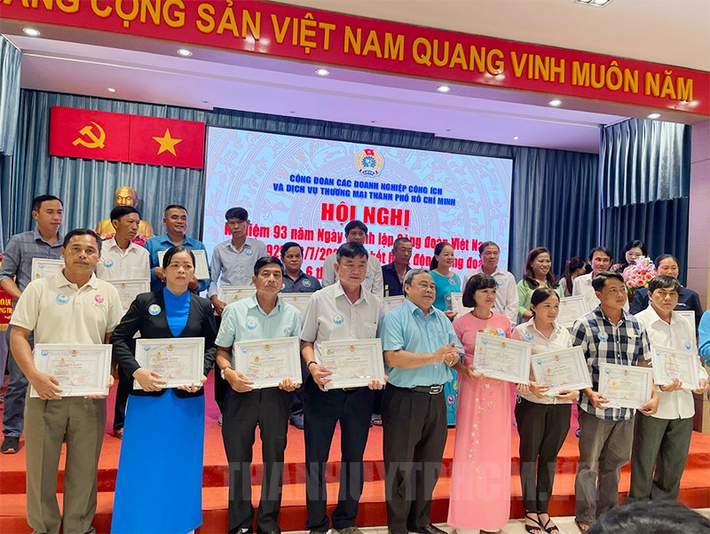 Đồng chí Giang Văn Nam trao Kỷ niệm chương "Vì sự nghiệp công đoàn".Dịp này, Ban Thường vụ Công đoàn Các doanh nghiệp công ích và dịch vụ thương mại TPHCM tổ chức trao tặng Cờ thi đua của Tổng Liên đoàn Lao động Việt Nam cho 1 tập thể có thành tích xuất sắc trong phong trào lao động giỏi và xây dựng tổ chức công đoàn vững mạnh năm 2020; Bằng khen của Tổng Liên đoàn cho 3 tập thể và 4 các nhân có thành tích xuất sắc trong phong trào lao động giỏi và xây dựng tổ chức công đoàn vững mạnh năm 2020; tặng Kỷ niệm chương “Vì sự nghiệp xây dựng tổ chức công đoàn” cho 4 cán bộ lãnh đạo, cán bộ công đoàn đã có nhiều đóng góp xây dựng tổ chức công đoàn Việt Nam; Bằng khen của Liên đoàn Lao động TP về công tác chăm lo Tết Nguyên đán Nhâm Dần năm 2022; 61 cá nhân đã có thành tích tiêu biểu trong Chương trình 75.000 sáng kiến vượt khó, phát triển; 5 cá nhân khen thưởng thành tích hưởng ứng Tháng lao động giỏi năm 2022; khen thưởng Chương trình “01 triệu sáng kiến nỗ lực - vượt khó, sáng tạo, quyết tâm chiến thắng đại dịch Covid-19”. Công đoàn Các doanh nghiệp công ích và dịch vụ thương mại TPHCM tặng Giấy khen 49 cá nhân được tuyên dương “Người cán bộ công đoàn của chúng tôi” năm 2022; tuyên dương 72 gia đình công nhân lao động đạt Gia đình tiêu biểu “Xây dựng hôn nhân bền vững, hạnh phúc, nuôi dạy con ngoan, học giỏi, thành đạt”.