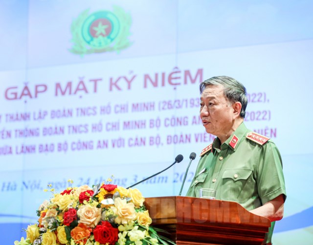 Bộ trưởng Bộ Công an Tô Lâm phát biểu tại buổi gặp mặt.(Thanhuytphcm.vn) - Chiều 24/3, tại Hà Nội, Bộ Công an tổ chức chương trình gặp mặt kỷ niệm 91 năm Ngày thành lập Đoàn Thanh niên Cộng sản Hồ Chí Minh (26/3/1931 - 26/3/2022), 66 năm truyền thống Đoàn Thanh niên Cộng sản Bộ Công an (1956 - 2022) và đối thoại giữa lãnh đạo Bộ Công an, Ban Bí thư Trung ương Đoàn với đoàn viên, thanh niên tiêu biểu lực lượng công an nhân dân.