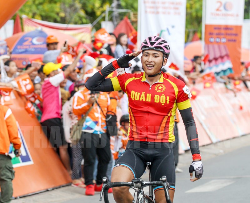 Tay đua Nguyễn Huỳnh Phú Lộc với kiểu chào quân đội ấn tượng khi giành chiến thắng chặng 29(Thanhuytphcm.vn) - Ngày 29/4, tay đua Nguyễn Huỳnh Phú Lộc (Quân đội) đã xuất sắc giành chiến thắng ở chặng đua 29 giải xe đạp Cúp Truyền hình TPHCM - Tôn Đông Á 2018, từ TP Rạch Giá, Kiên Giang về TP Vĩnh Long, tỉnh Vĩnh Long dài 144km.