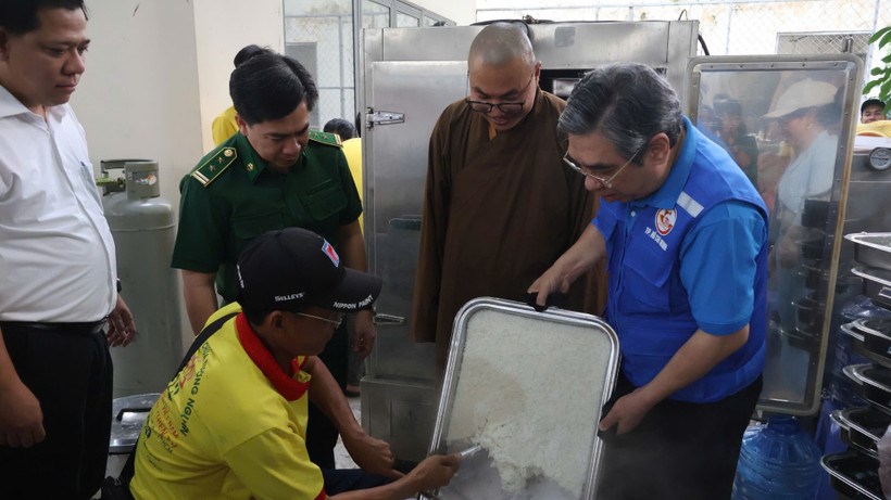 Đồng chí Nguyễn Phước Lộc, Phó Bí thư Thành ủy, Chủ tịch Ủy ban Mặt trận Tổ quốc Việt Nam Thành phố Hồ Chí Minh trực tiếp kiểm tra bếp ăn dã chiến (Ảnh Nhân dân)