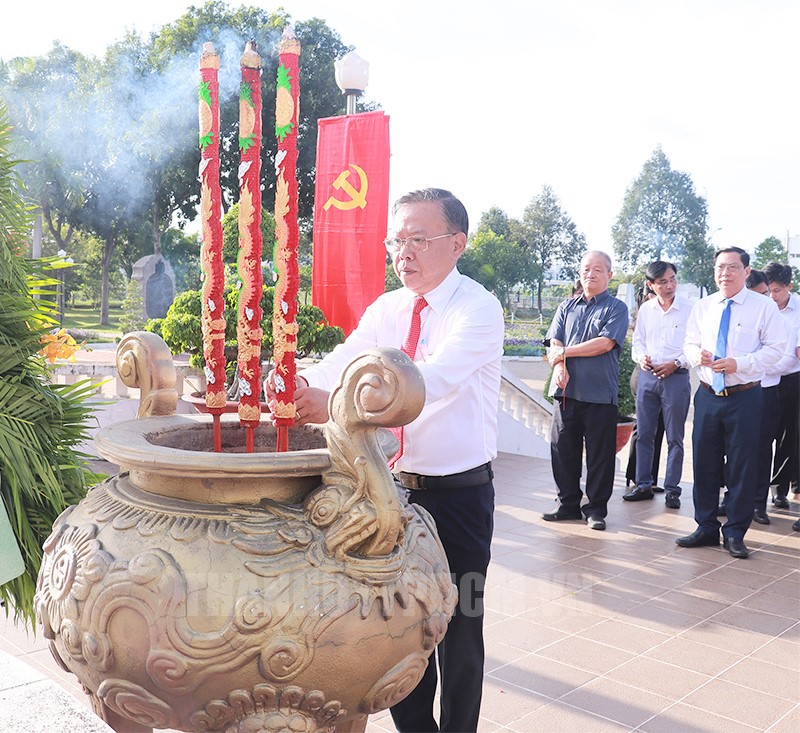 Đồng chí Nguyễn Hữu Hiệp, Bí thư Thành ủy Thủ Đức cùng các thành viên đoàn 1 dâng hương tại Đến tưởng niệm Bến Nọc. (Ảnh: Lương Hợp)(Thanhuytphcm.vn) - Kỷ niệm 76 năm ngày Thương binh - Liệt sĩ (27/7/1947 - 27/7/2023); sáng 26/7, Thành ủy - HĐND - UBND - Ủy ban MTTQ Việt Nam TP Thủ Đức tổ chức 5 đoàn lãnh đạo đến viếng và dâng hương tại các nghĩa trang liệt sĩ, địa chỉ đỏ, di tích lịch sử trên địa bàn TP Thủ Đức nhằm bày tỏ lòng tri ân sâu sắc đối với Chủ tịch Hồ Chí Minh, các anh hùng liệt sĩ và các Mẹ Việt Nam Anh hùng.