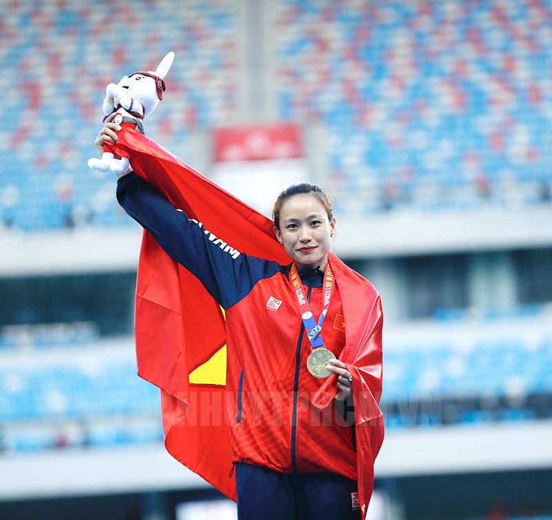 Huỳnh Thị Mỹ Tiên nhận HCV 100m rào nữ. (Ảnh: T.Ninh)(Thanhuytphcm.vn) - Ngày 10/5, đoàn thể thao Việt Nam đã thu về 11 HCV, vươn lên dẫn đầu bảng xếp hạng toàn đoàn SEA Games 32.