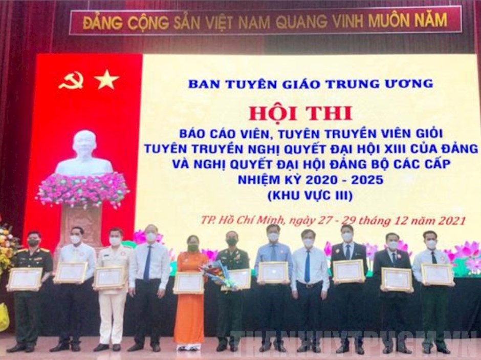 Trao giải cho các thí sinh đạt giải(Thanhuytphcm.vn) - Chiều 29/12, Hội thi Báo cáo viên, tuyên truyền viên giỏi khu vực III năm 2021 đã bế mạc, sau 3 ngày diễn ra tại TPHCM. Hội thi có sự góp mặt của 23 đồng chí Báo cáo viên, tuyên truyền viên giỏi đến từ Đảng bộ Quân đội, Đảng bộ Công an Trung ương và 18 tỉnh thành phố phía Nam.