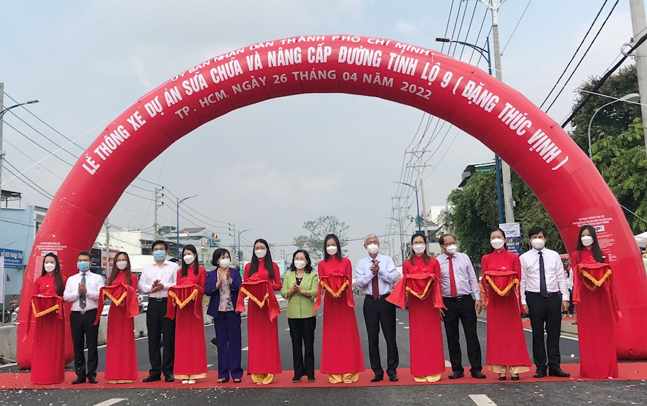 Các đại biểu thực hiện nghi thức cắt băng thông xe Dự án Sửa chữa và nâng cấp đường Tỉnh lộ 9. (ảnh: Đan Như)(Thanhuytphcm.vn) - Sáng 26/4, tại huyện Hóc Môn, Ban Quản lý Dự án Đầu tư xây dựng các công trình giao thông TPHCM đã tổ chức Lễ thông xe Dự án Sửa chữa và nâng cấp đường Tỉnh lộ 9 (đường Đặng Thúc Vịnh). Đây là một trong 5 công trình, gói thầu được đưa vào khai thác, phục vụ người dân TPHCM nhân kỷ niệm 47 năm Ngày Giải phóng miền Nam, thống nhất đất nước (30/4/1975 - 30/4/2022) và 136 năm Ngày Quốc tế Lao động (1/5/1886 - 1/5/2022).