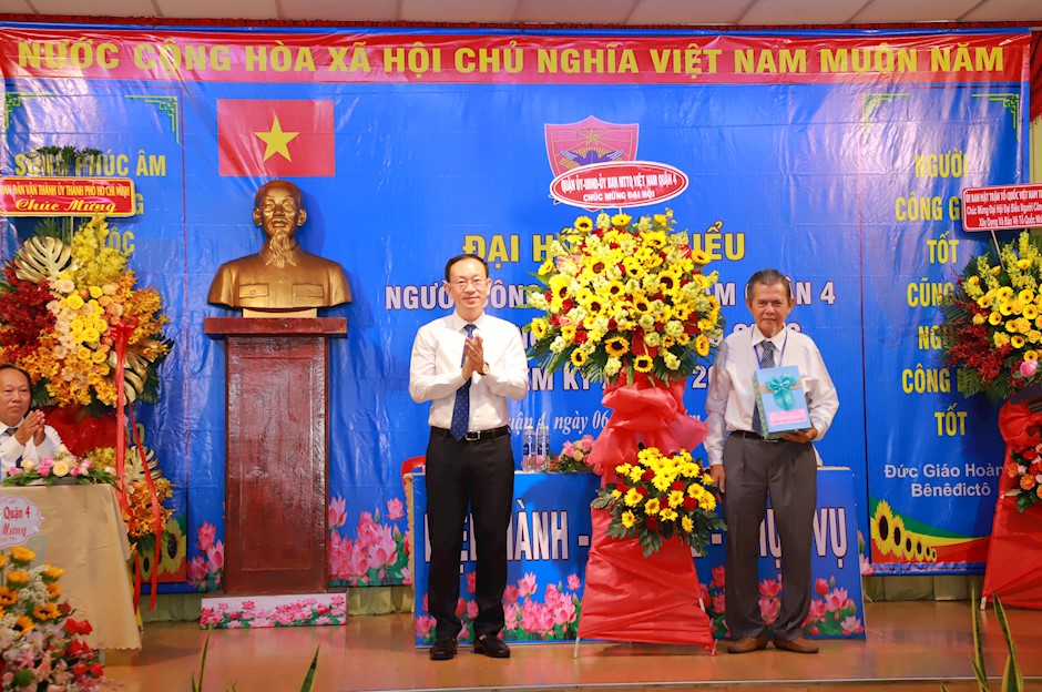 Đồng chí Nguyễn Quốc Thái, Bí thư Quận ủy Quận 4 tặng hoa và quà chúc mừng Đại hội(Thanhuytphcm.vn) - Sáng 6/5, Ban Đoàn kết Công giáo Quận 4 tổ chức Đại hội đại biểu Người Công giáo Việt Nam Quận 4 xây dựng và bảo vệ Tổ quốc, nhiệm kỳ 2023 – 2028.
