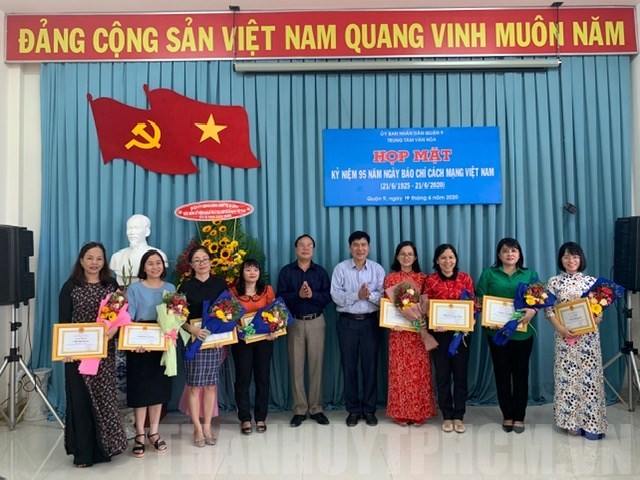 Lãnh đạo Quận 9 trao giấy khen cho các cá nhân(Thanhuytphcm.vn) - Ngày 19/6, tại Nhà truyền thống Di tích lịch sử căn cứ Vùng bưng Sáu xã, Trung tâm Văn hóa Quận 9 tổ chức họp mặt kỷ niệm 95 năm Ngày Báo chí Cách mạng Việt Nam (21/6/1925 – 21/6/2020). Đến dự có các đồng chí: Cao Văn Minh, Phó Bí thư Thường trực Quận ủy; Nguyễn Chiến Chinh, Trưởng Ban Tuyên giáo Quận ủy; Cao Thị Ngọc Châu, Trưởng Ban Dân vân Quận ủy; Nguyễn Ngọc Cường, Phó Chủ tịch UBND Quận 9.