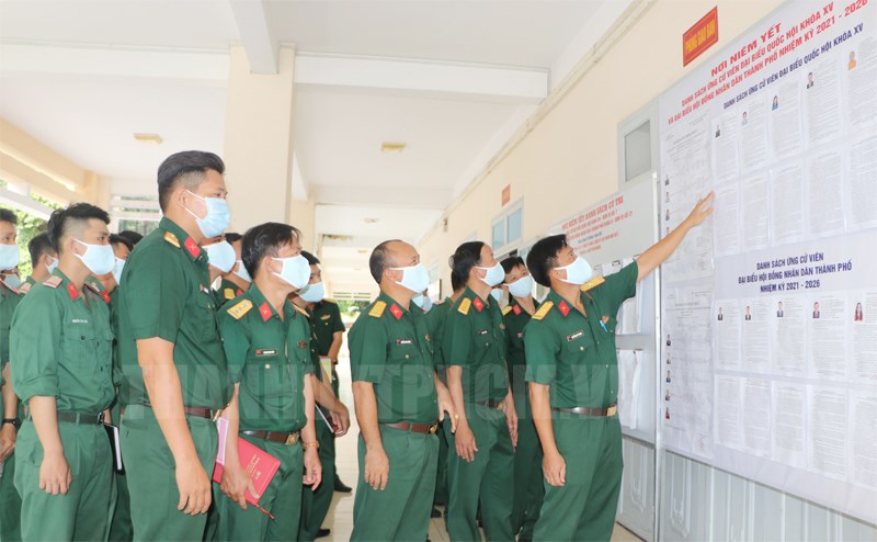 Cán bộ, chiến sĩ Tiểu đoàn 180 tìm hiểu thông tin các ứng cử viên đại biểu Quốc hội khóa XV và HĐND các cấp nhiệm kỳ 2021 - 2026.(Thanhuytphcm.vn) - Ngày bầu cử đại biểu Quốc hội khóa XV và đại biểu Hội đồng Nhân dân các cấp nhiệm kỳ 2021 - 2026 đang đến gần. Cùng với quân - dân cả nước, các đơn vị LLVT Quân khu tích cực chuẩn bị tốt cho cuộc bầu cử theo đúng quy trình, kế hoạch, đảm bảo dân chủ và đúng luật. Tại Tiểu đoàn 180, Bộ Tham mưu Quân khu, mỗi cán bộ, chiến sĩ đều ý thức được vinh dự và trách nhiệm của mình, hướng đến ngày bầu cử với tinh thần tập trung đảm bảo tốt cho ngày hội non sông.