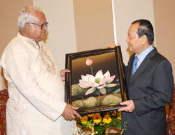 Bí thư Thành ủy TPHCM Lê Thanh Hải tặng quà lưu niệm cho Chủ tịch Đảng Cộng sản Băng-la-đét, đồng chí Mazurrul Ahsan Khan