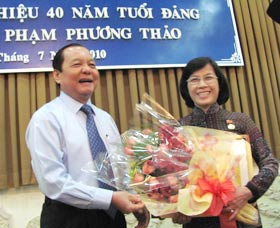 (Website TU)- Ngày 5-7, tại trụ sở UBND TPHCM đã long trọng diễn ra lễ trao Huy hiệu 40 năm tuổi Đảng cho đồng chí Phạm Phương Thảo, Phó Bí thư Thành ủy, Chủ tịch HĐND TP, Trưởng đoàn ĐBQH TPHCM. Đến tham dự buổi lễ có các đồng chí: Lê Thanh Hải, Ủy viên Bộ Chính trị, Bí thư Thành ủy TPHCM; Lê Hoàng Quân, Ủy viên Trung ương Đảng, Chủ tịch UBND TPHCM; Nguyễn Văn Đua, Phó Bí thư Thường trực Thành ủy TPHCM; các đồng chí trong ban Thường vụ Thành ủy, Thường trực HĐND TP, UBND TP, lãnh đạo các ban Đảng Thành ủy cùng các đồng chí thành viên trong Đoàn ĐBQH TP.