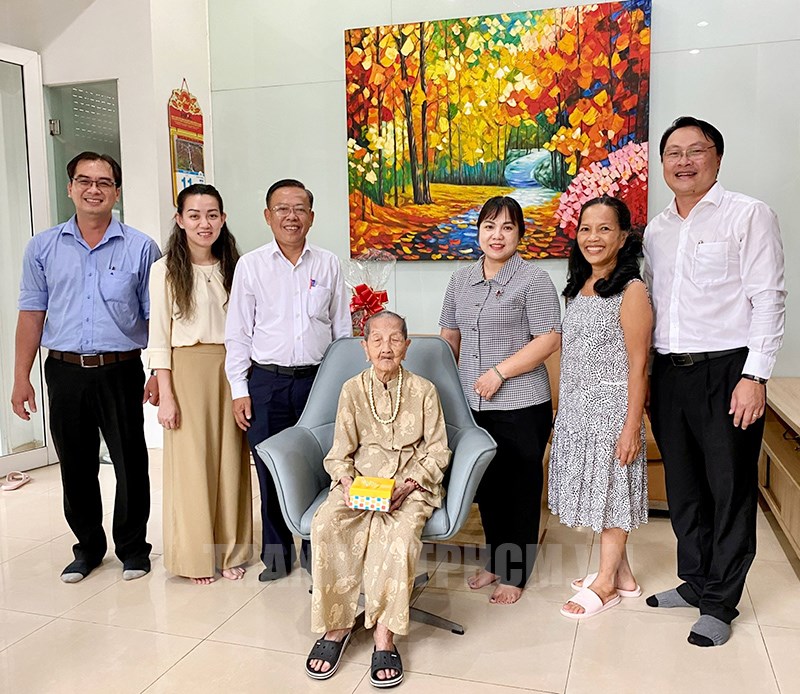 Đoàn đến thăm Mẹ Việt Nam Anh hùng Trần Thị Nho, ngụ tại đường Quốc Hương, Khu phố 5, phường Thảo Điền, TP Thủ Đức. Mẹ Trần Thị Nho năm nay 102 tuổi, có chồng là liệt sĩ Trịnh Ngọc Kế tham gia kháng chiến chống Pháp và Mỹ, hy sinh năm 1970 và có một người con là liệt sĩ tham gia kháng chiến chống Mỹ, hy sinh năm 1972.