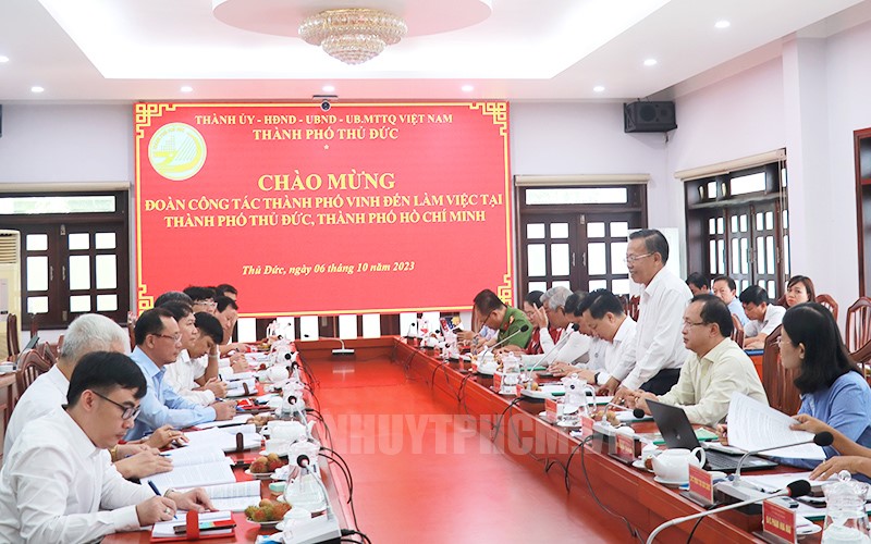 Đoàn công tác TP Vinh trao tặng quà lưu niệm đến TP Thủ Đức.Phát biểu tại buổi làm việc, đồng chí Nguyễn Hữu Hiệp thông tin một số nét đặc trưng nổi bật, lộ trình hình thành và xây dựng TP Thủ Đức; quá trình ban hành Nghị quyết số 98/2023/QH15 của Quốc hội về thí điểm một số cơ chế, chính sách đặc thù phát triển TPHCM, sẽ mở ra một chương mới cho sự phát triển của TPHCM nói chung và TP Thủ Đức nói riêng, có ý nghĩa quan trọng để TP Thủ Đức phát triển thành Trung tâm kinh tế tài chính, cực tăng trưởng của vùng Đông Nam bộ. Qua đó, Bí thư Thành ủy Thủ Đức mong muốn TP Vinh cần có Nghị quyết riêng trình Chính phủ để xây dựng TP Vinh phát triển nhanh, đột phá, trở thành động lực tăng trưởng kinh tế của tỉnh Nghệ An, trung tâm của khu vực Bắc Trung bộ; hy vọng với sự tương đồng của 2 địa phương, TP Thủ Đức và TP Vinh sẽ kết nghĩa, có những hoạt động phối hợp, hỗ trợ nhau phát triển trong thời gian tới…