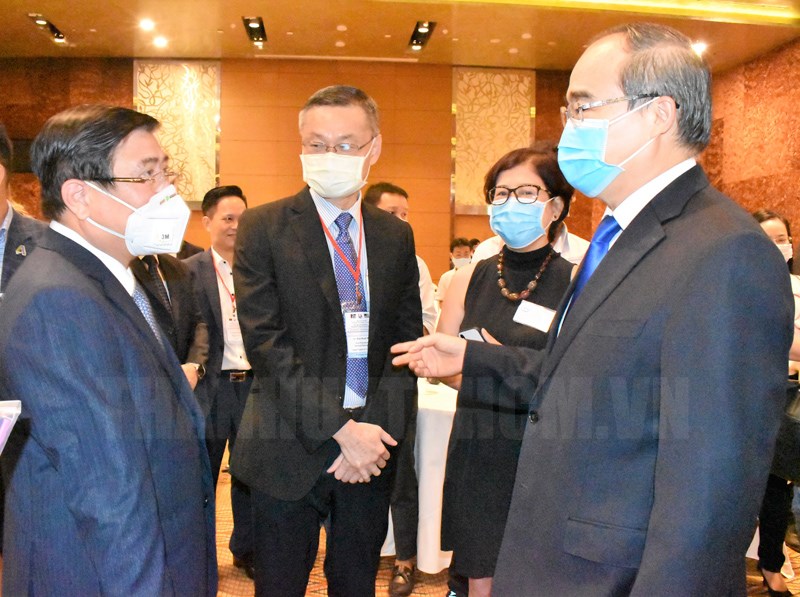 Chủ tịch UBND TPHCM Nguyễn Thành Phong phát biểu kết luận diễn đàn. Chủ tịch UBND TP Nguyễn Thành Phong cho biết: Lãnh đạo TPHCM đã chia sẻ về tầm nhìn, về các kế hoạch cụ thể phát triển TP Thủ Đức, trung tâm tài chính, dự án xây dựng đô thị thông minh, kế hoạch để trở thành TP khu vực và quốc tế. TP sẽ và phải tham gia sâu hơn vào nền kinh tế toàn cầu. TP thực hiện các kế hoạch phát triển đó bằng nỗ lực tự thân, sự hỗ trợ của chính quyền Trung ương và bằng sự hợp tác với bạn bè quốc tế. “Tôi kỳ vọng người bạn chân thành, đối tác tin cậy Hoa Kỳ sẽ cùng chúng tôi thực hiện tầm nhìn đó bằng cách chung tay triển khai các dự án hợp tác cùng có lợi và cùng trở thành một phần của sự phát triển của TPHCM. Tôi cũng mong muốn tầm nhìn và các kế hoạch phát triển cụ thể đó sẽ tiếp tục là động lực để thúc đẩy quan hệ TPHCM - Hoa Kỳ đi xa hơn nữa, vượt mức 1 tỷ USD đầu tư và 9 tỷ USD kim ngạch xuất nhập khẩu hiện nay” - Chủ tịch UBND TP Nguyễn Thành Phong mong muốn.