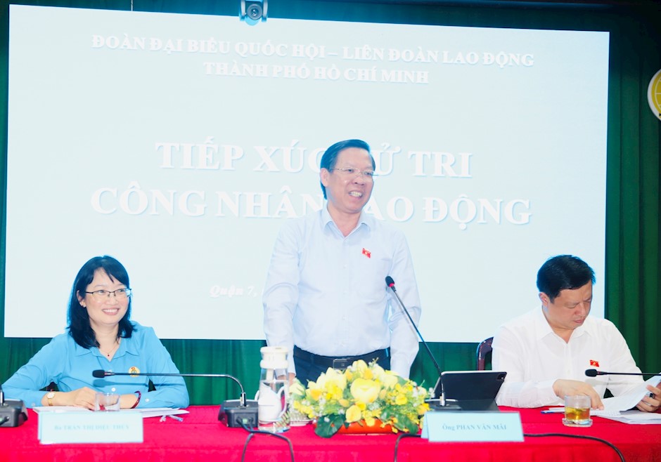 Chủ tịch UBND TPHCM Phan Văn Mãi phát biểu tại buổi tiếp xúc(Thanhuytphcm.vn) – Chiều 6/5, Đoàn Đại biểu Quốc hội (ĐBQH) khóa XV TPHCM phối hợp Liên đoàn Lao động (LĐLĐ) TPHCM tổ chức buổi tiếp xúc cử tri công nhân lao động đang làm việc trên địa bàn Quận 7 và Khu chế xuất Tân Thuận góp ý dự án Luật Bảo hiểm xã hội (sửa đổi) và Luật Nhà ở (sửa đổi). Đến tham dự có các ĐBQH gồm: Ủy viên Trung ương Đảng, Phó Bí thư Thường trực Thành ủy, Chủ tịch UBND TP, Trưởng đoàn ĐBQH TP Phan Văn Mãi; Thiếu tướng Dương Văn Thăng, Phó Chánh án Tòa án Nhân dân tối cao, Chánh án Tòa án Quân sự Trung ương; Thành ủy viên, Chủ tịch LĐLĐ TP Trần Thị Diệu Thúy.