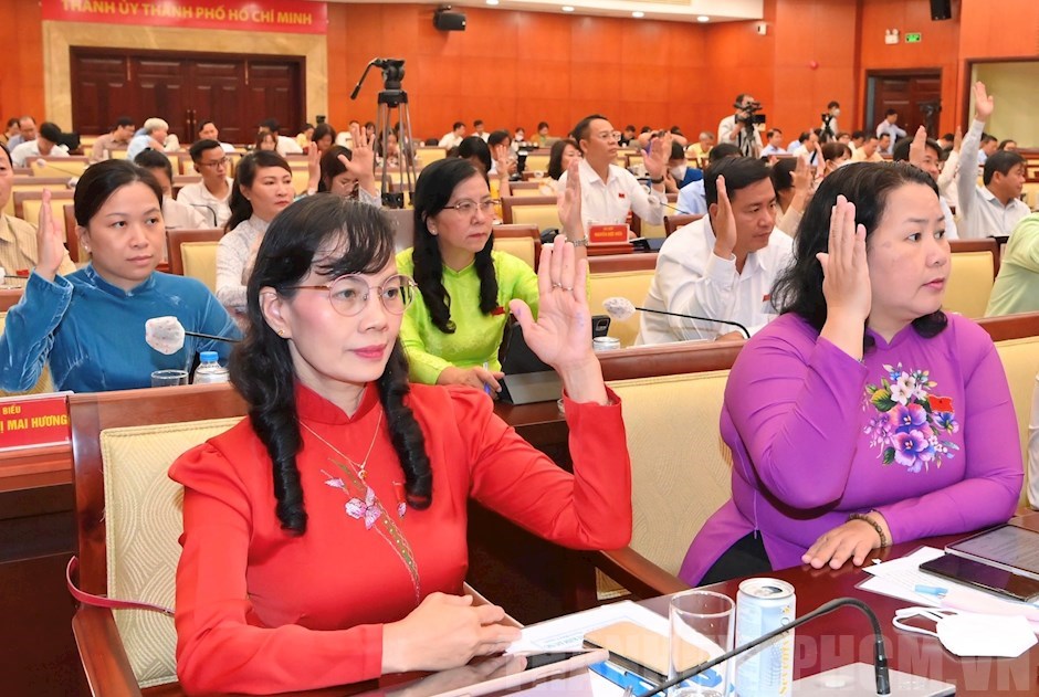 Các đại biểu biểu quyết thông qua tờ trình(Thanhuytphcm.vn) - Ngày 11/10, tại kỳ họp thứ 7 - kỳ họp chuyên đề, HĐND TP khoá X, nhiệm kỳ 2021 - 2026, các đại biểu đã quyết nghị thông qua chính sách đặc thù hỗ trợ học phí cho trẻ mầm non, học sinh phổ thông công lập, ngoài công lập và học viên giáo dục thường xuyên trên địa bàn TP năm học 2022 - 2023.