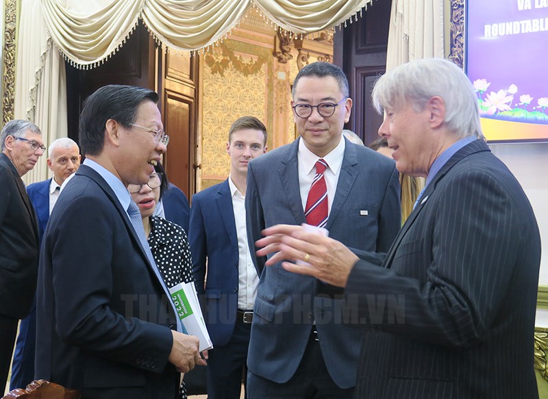 Chủ tịch UBND TP Phan Văn Mãi chụp hình lưu niệm cùng các Hiệp hội doanh nghiệp nước ngoàiTại buổi tọa đàm, các Hiệp hội DN nước ngoài đã nêu những kiến nghị, đề xuất cụ thể cho sự phát triển KT-XH của TP trong thời gian tới. Trong đó, Hiệp hội DN Hoa Kỳ mong muốn TP tiếp tục cải thiện nâng cao môi trường đầu tư, tạo thuận lợi cho các DN để thu hút nguồn đầu tư mới và duy trì, tăng trưởng nguồn đầu tư đang có sẵn. Đồng thời, đẩy nhanh đầu tư mở rộng hạ tầng giao thông, chú trọng đến nâng cao chất lượng chăm sóc sức khỏe, giáo dục, chính sách thúc đẩy nội địa hóa chuỗi cung ứng; đầu tư hạ tầng giao thông vận tải, logistics; các hành động thiết yếu để đáp ứng an ninh năng lượng và chuyển đổi năng lượng sạch; và khuyến khích tăng cường đầu tư công nghệ cao và nâng cao năng lực nghiên cứu và phát triển. Hiệp hội DN Italy, cũng mong TP sẽ sớm cải thiện về môi trường, giao thông, rút ngắn, đơn giản thủ tục hải quan…