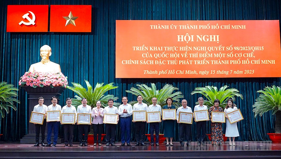 Chủ tịch UBND TPHCM Phan Văn Mãi và Chủ tịch Ủy ban MTTTQ Việt Nam TPHCM Trần Kim Yến trao Bằng khen cho các tập thể xuất sắcTại hội nghị, UBND TPHCM đã trao tặng Bằng khen cho 39 tập thể, 162 cá nhân đã có thành tích xuất sắc trong công tác tham mưu, biên soạn và hoàn thành Đề án trình Quốc hội ban hành Nghị quyết 98, góp phần tích cực trong phong trào thi đua của TP.